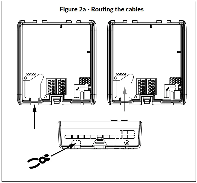 - Route the cables through the opening in the back plate or for surface wiring select a knockout on the bottom of the wall plate, as shown in Figure 2a.