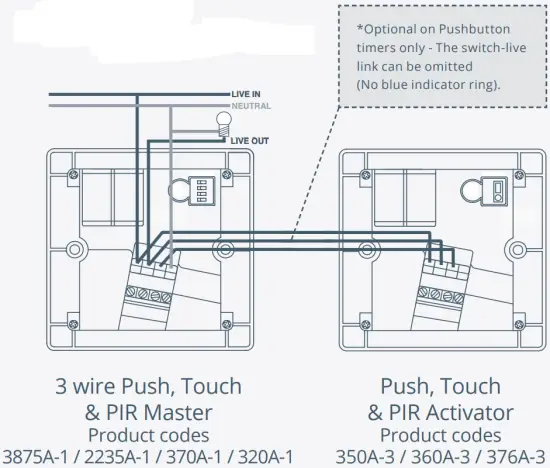 Pushbutton & Touch Button Activators – Press or Touch the activator button once to remotely trigger the associated master timer to switch ON. This will switch the light source or appliance ON and initiate the pre-set timing delay sequence.