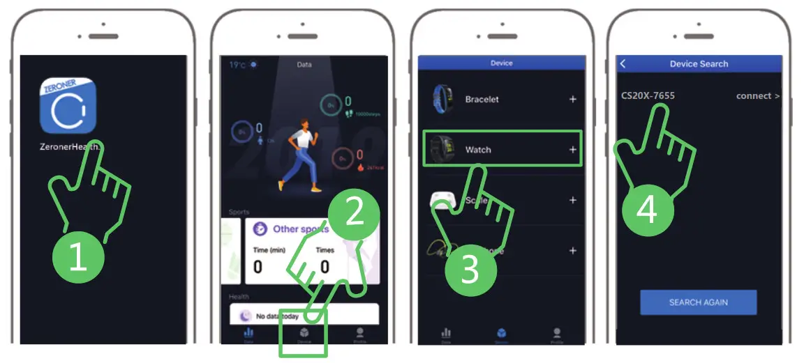 Turn on the GPS and Bluetooth on your cellphone=>Go to”Zeroner Health Pro”app=>Device=>Watch—-Search the device=>Find your watch and connect