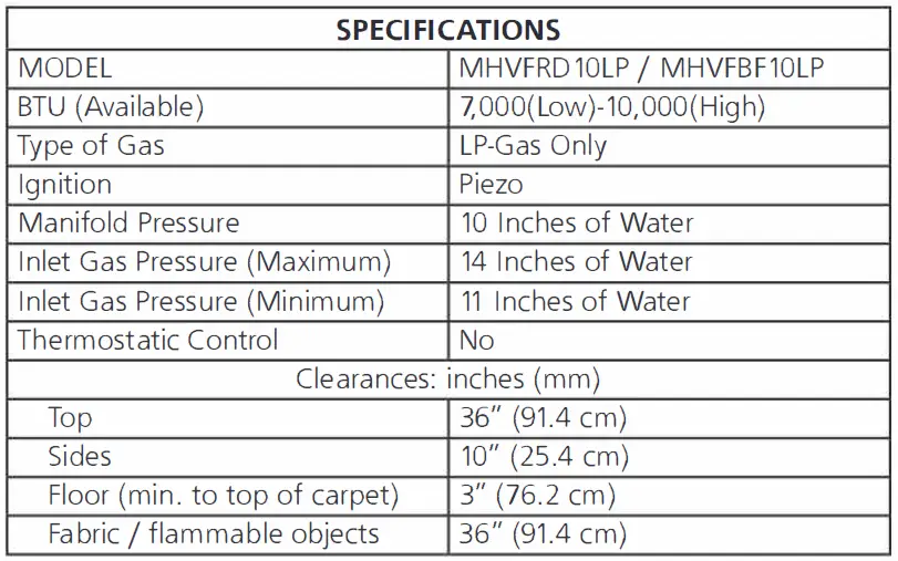 - Either of the 10,000 BTU (2931 W) units (the MHVFRD10LP or the MHVFBF10LP) may be installed in a bedroom, but shall not be installed in a bathroom or any place where a strong wind would shut down the appliance.