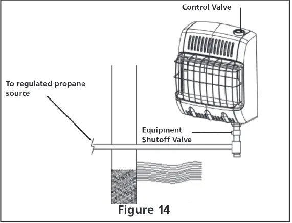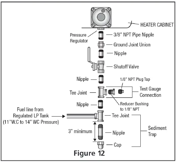 CAUTION: Never connect heater directly to the Propane supply. This heater requires an external regulator (not supplied). Install the external regulator between the heater and Propane/LP supply.