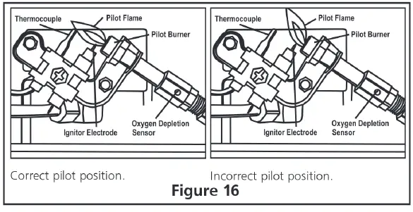Figure 17 show a correct pilot flame pattern and also shows an incorrect pilot flame pattern. The incorrect pilot flame pattern is not touching thermocouple. This will cause the thermocouple to cool. When the thermocouple cools, the heater will shut down. If pilot flame pattern is incorrect, as shown in Figure 17: