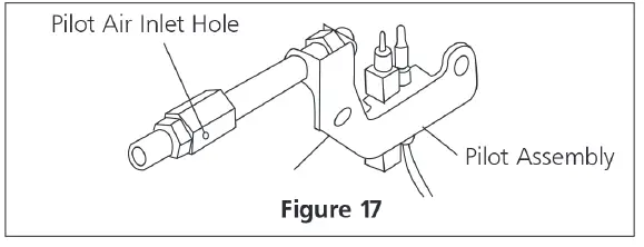 A yellow tip on the pilot flame indicates dust and dirt in the pilot assembly. To clean the pilot assembly find the small pilot air inlet hole about two inches from where the pilot flame comes out of the pilot assembly (see figure 18). With the unit off, lightly blow air through the air inlet hole. You may blow through a drinking straw if compressed air is not available.