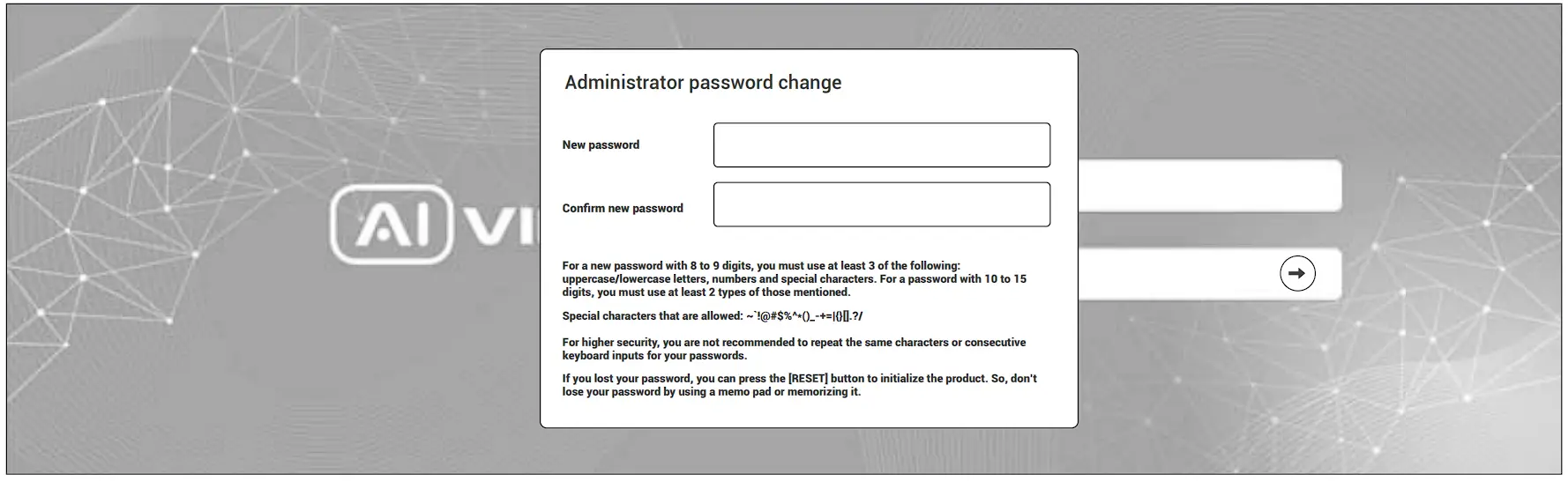 When the “Administrator password change” window appears, enter a new password.
