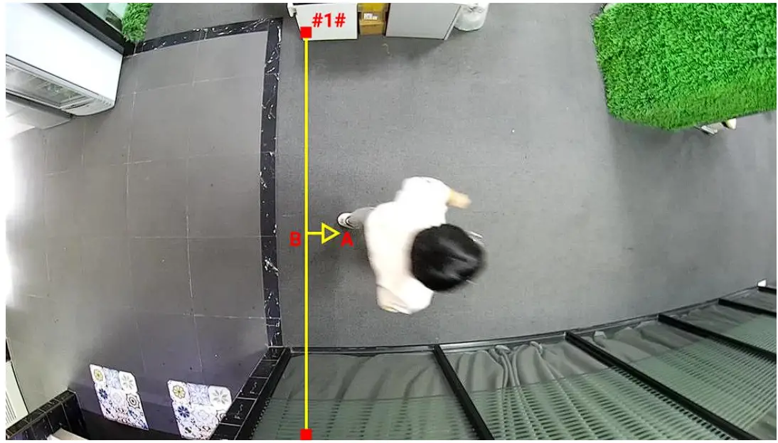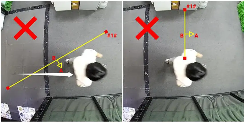 The following are two common configurations that are detrimental to Line Crossing and People Counting. In picture 1, the angle between the detection line and the direction of target is too small, resulting in easy missed detection. In picture 2, the detection line does not completely cut off the path that target may pass through, causing missed detection.