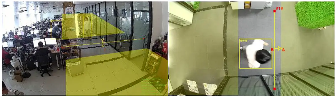 Top-mounted cameras can better separate objects to avoid obstruction. While using Line Crossing or People Counting, top-mounted camera can better distinguish between shoulder-to-shoulder people.