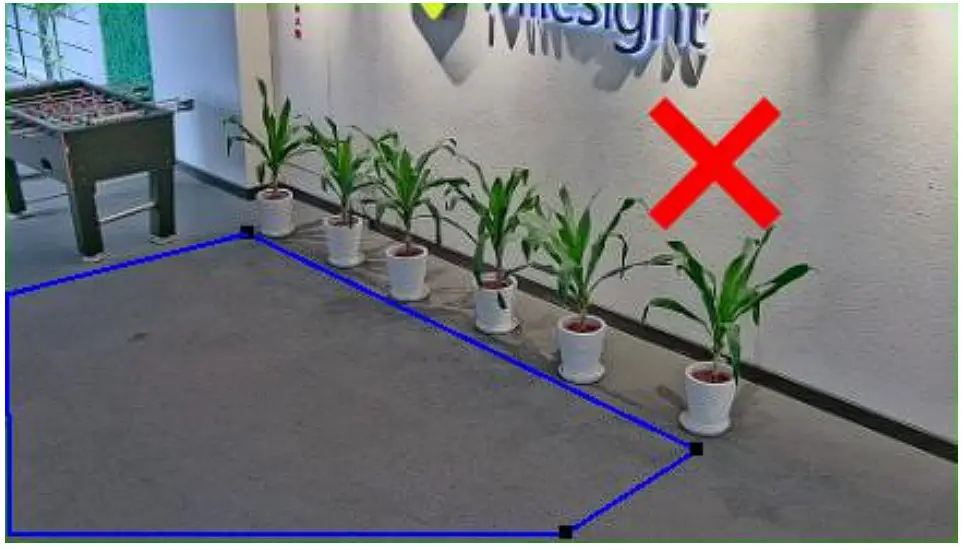 For VCA events that require configuration of detection regions, it should be noted that, different from some other brand products, the region is not set according to the horizontal area in the space but is perpendicular to the plane of the center line of the camera’s field of view. The following two pictures show the wrong detection region configuration and the schematic of Milesight detection region.