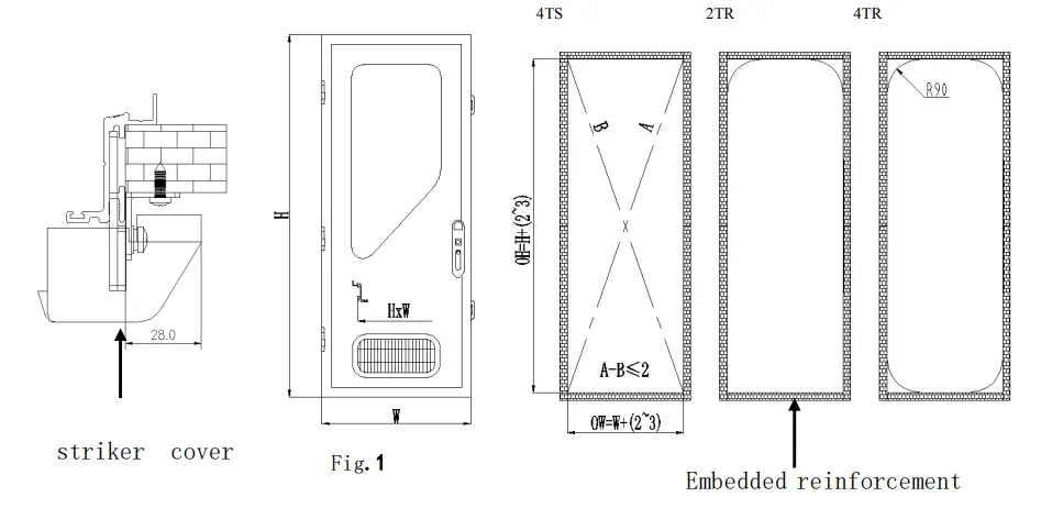According to door size( HxW), cut out the hole (0HxOW).The embedded reinforcement is required around the hole,as Fig. 1.If fix the striker back brace and striker cover, you must leave enough space for it around the hole in the caravan