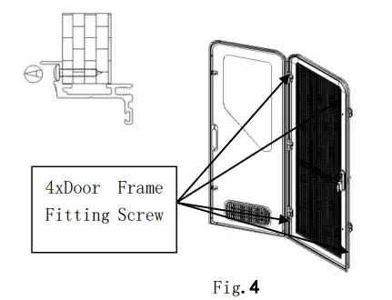 - Fix the door frame to the caravan frame with the MINIMUM of one screw in each outside corner area. The door frame should now be fixed into position and unable to move within the caravan frame. As in Fig. 4