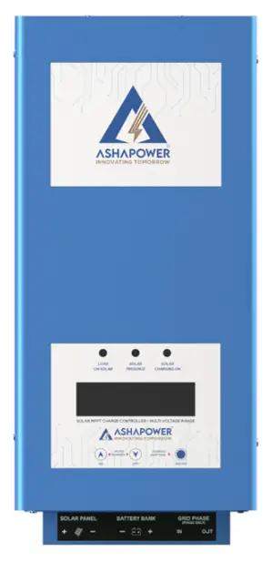 Thank you for purchasing ASHAPOWER® SURYA-50 Vers. 7.7 MPPT charge controller. It is a multi voltage range device with unique features. The same device can be used for charging 1 battery (12V ) to a battery bank of 2x12V (24V) in series. The device automatically detects and configures itself to the connected battery bank. The high Voc range (open circuit voltage) of the device makes it easier to group the PV panels conveniently. The maximum power point tracking (MPPT) technology of the charge controller optimizes the maximum power production from the connected PV panel array.