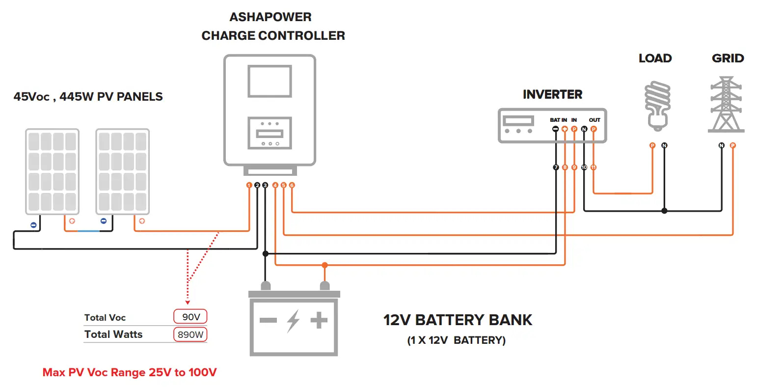 | 12V | 25-100V | 45 Voc (445W PANEL) X 2 PANEL IN SERIES = 90 Voc = 890W | 1000W |