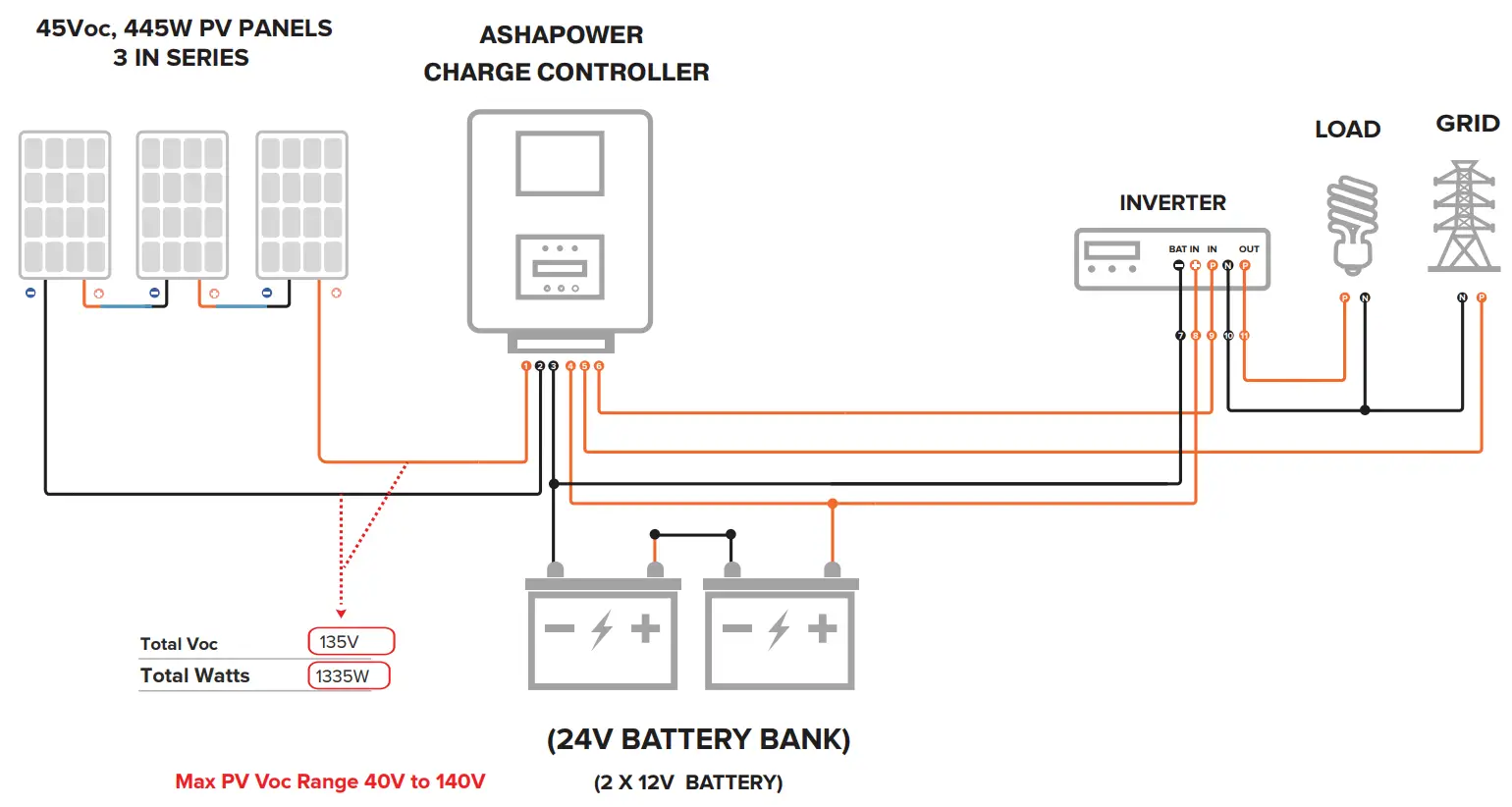 | 24V | 40-140V | 45 Voc (445W PANEL) X 3 PANEL IN SERIES = 135 Voc =1335W | 1600W |