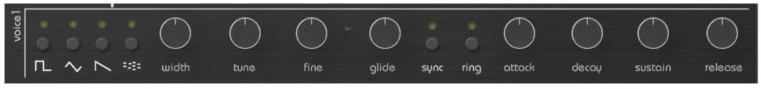 TherapSID’s 3 voices are laid out across the top half of the control panel. The 3 voice strips are identical in functionality, explained from left to right:
