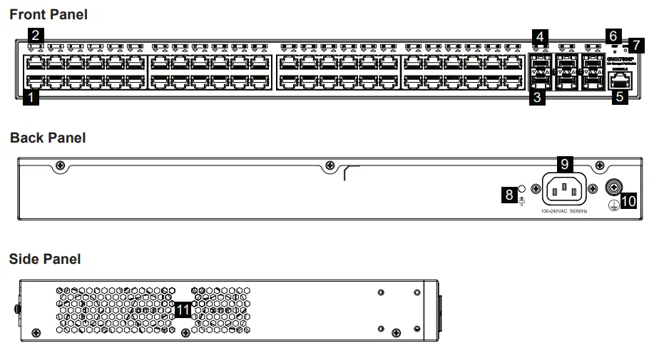 | 1 | Port 1-48 | 48x Ethernet RJ45(10/100/1000Mbps), used for connecting terminals Note: GWN7806P Ethernet ports support PoE/PoE+ |