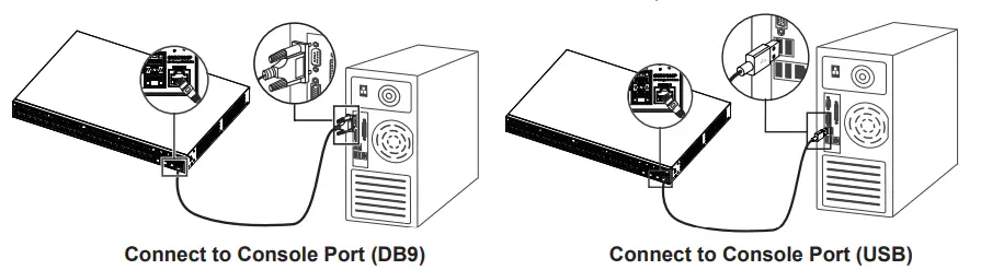 - Connect the console cable (prepared by yourself) to the DB9 male connector or USB port to the PC.