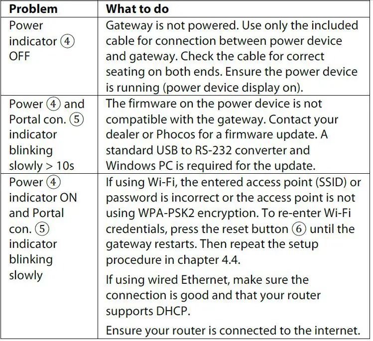 For a video to help with the installation visit www.phocos.com/phocoslink-cloud. Choose any of the power devices and connect the included cable with 8P8C connectors (any direction) between the RS-232 port of the power device and the ③ RS-232 port of the gateway. Ensure the power device is not in standby and that its display is on. The power ④ and portal connectivity ⑤ indicators will blink several times while the gateway starts up (see chapter 5 for details). If using wired Ethernet, connect the Ethernet cable from your router to port ⑦ of the gateway.