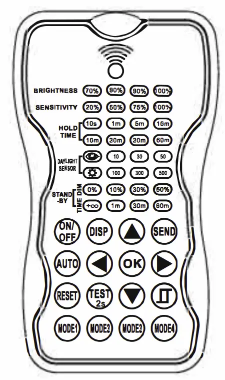 | MODE | BRIGHTNESS | SENSITIVITY | HOLD TIME | DAYLIGHT SENSOR | STAND-BY DIM | STAND-BY TIME |