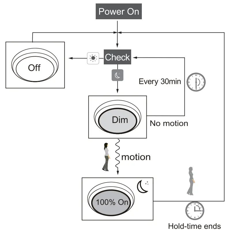 - After hold-time, the light dims to stand-by level if the surrounding natural light is below the daylight threshold.