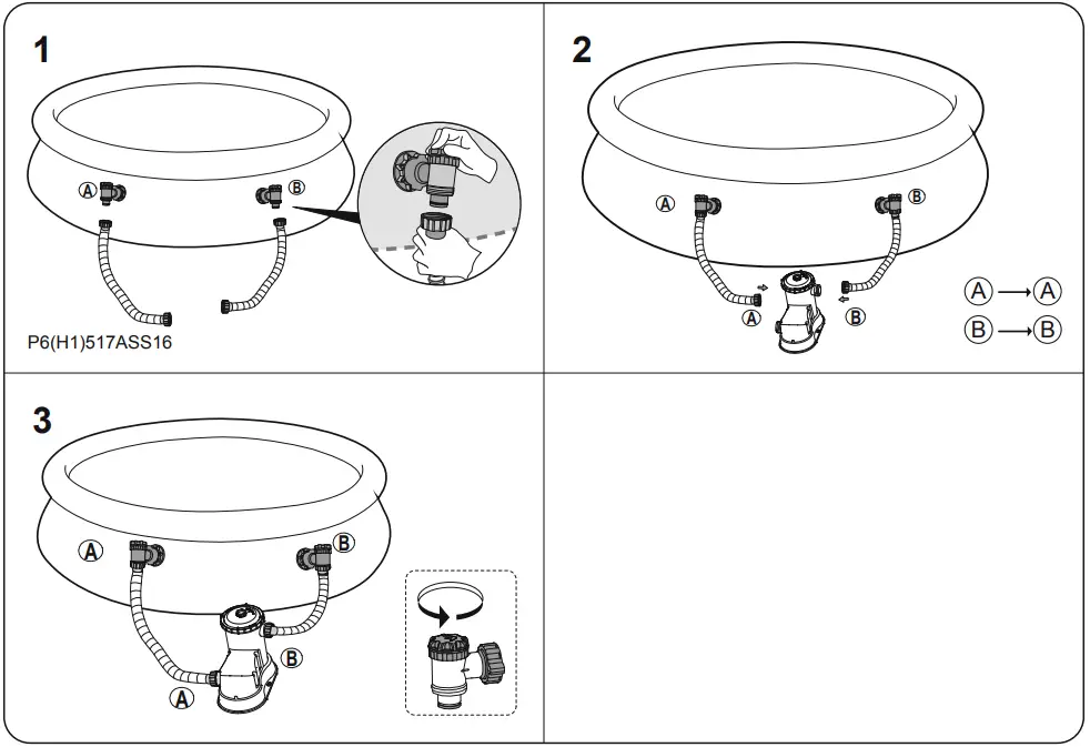 IMPORTANT: DO NOT DRY RUN THE FILTER PUMP – Make sure both the pool’s Inlet and Outlet valves are fulluy covered by water before operating the filter pump