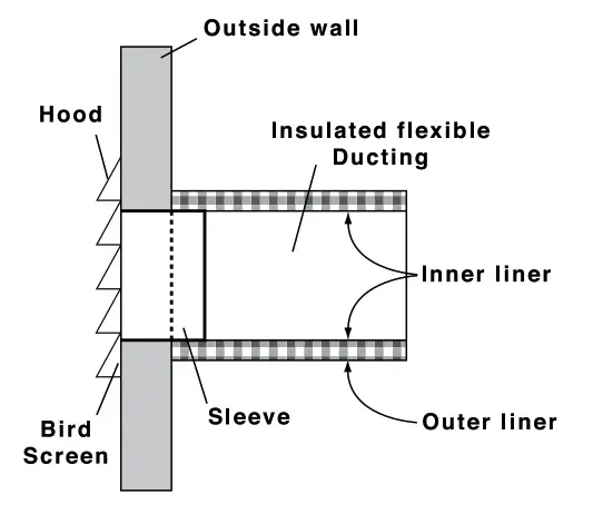 A well-designed and installed ducting system will allow the ERV to operate at its maximum efficiency. The inner liner of the flexible insulated duct must be secured to the sleeve of the weather hood (as close to the outside as possible) and to the appropriate duct connection on the ERV. The insulation should remain full and not be crushed. The outer liner, which acts as a vapor barrier, must be completely sealed to the outer wall and the ERV using tape and/or caulking. A good bead of high-quality caulking (preferably acoustical sealant) will seal the inner flexible duct to both the ERV duct connection and the weather hood prior to securing them.