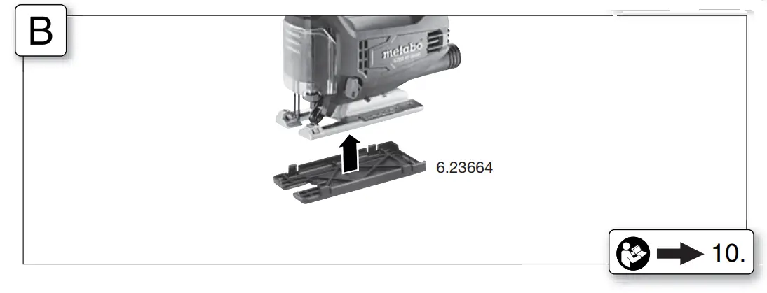 Turn the machine over so that the footplate faces upwards. Insert the anti-splintering footplate from the front, while noting the following 2 items: