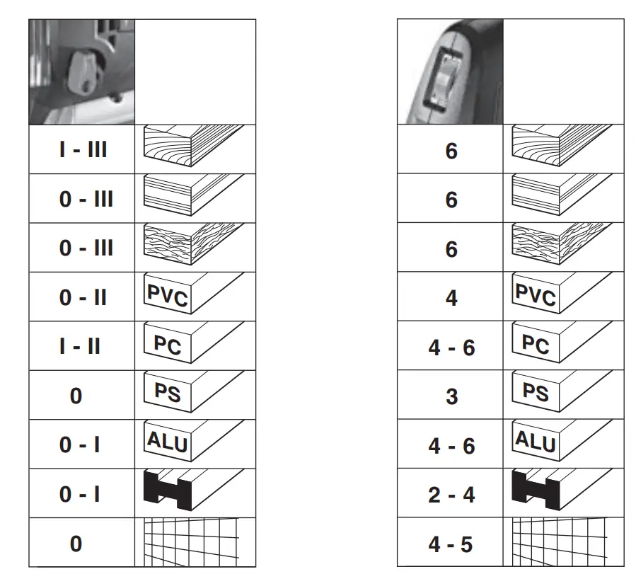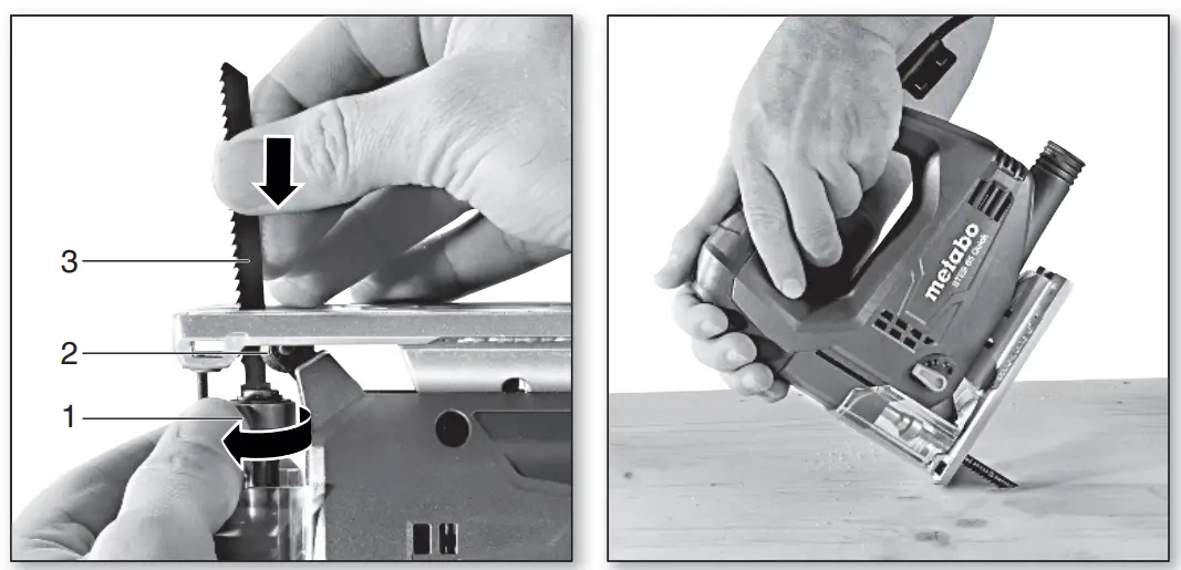 The jigsaw blade can plunge into workpieces made from thin, soft materials without the necessity of drilling a hole beforehand. Only use short saw blades. Only at 0° angle setting.