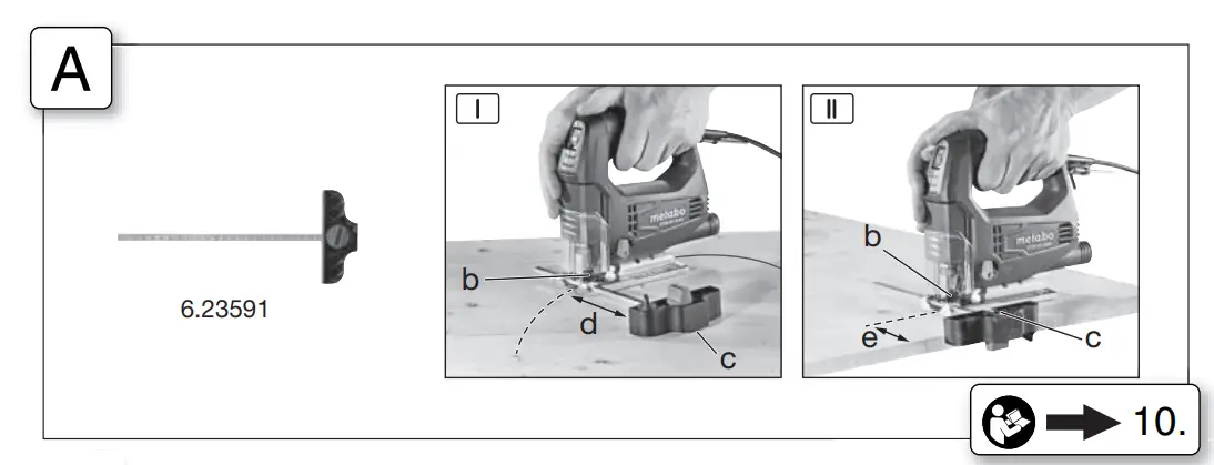 See illustration on page 2. Set the adjustment lever (6) to the “0” position (pendulum motion is deactivated). Position the jigsaw with the front edge of the footplate (5) on the workpiece. Hold the operating jigsaw firmly and guide slowly downwards. Once the saw blade has penetrated the workpiece, the pendulum motion can be activated.