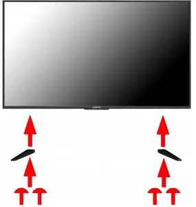 - Place the display unit flat on a table. Afterwards attach the plastic feet onto the bottom of the TV. Install the foot labeled L to the left side of the TV (when you are facing the front of the TV). Install the foot labeled R to the right side of the TV (when you are facing the front of the TV). Afterwards insert and tighten the 2 screw to the bottom of each foot.