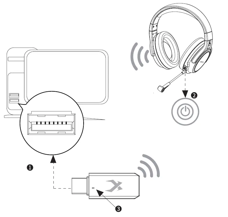 The headset and USB wireless adapter are paired and ready to use at the factory. If the headset loses pairing, you can manually re-pair it by following the steps below (it is recommended to contact technical support before re-pairing to determine if it is necessary)