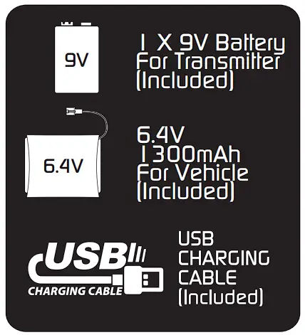 - Remove all batteries from the Vehicle and Transmitter when not in use for long period.