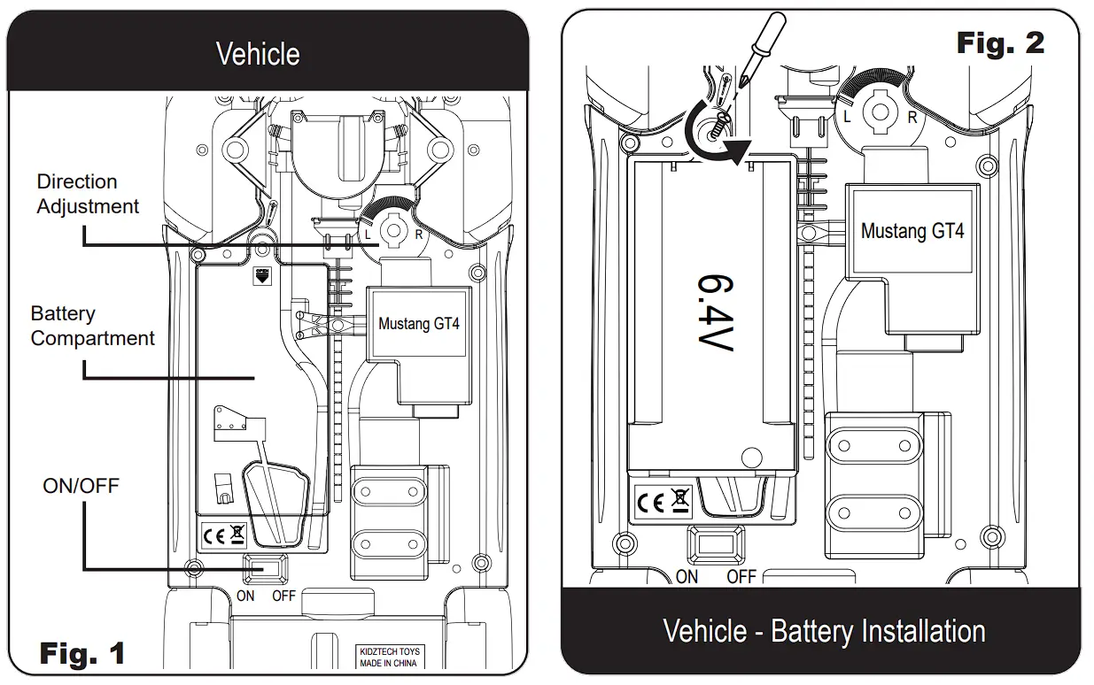 - Install 6.4V battery pack with correct polarities (+/-) as shown inside the battery compartment