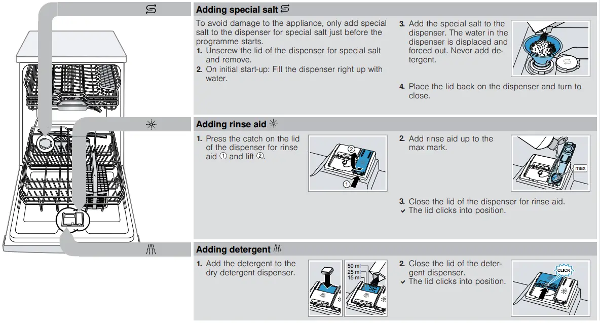 Only clean tableware that is suitable for dishwashers. Remove large remnants of food from the tableware. Check that the spray arms can rotate freely - Add detergent.