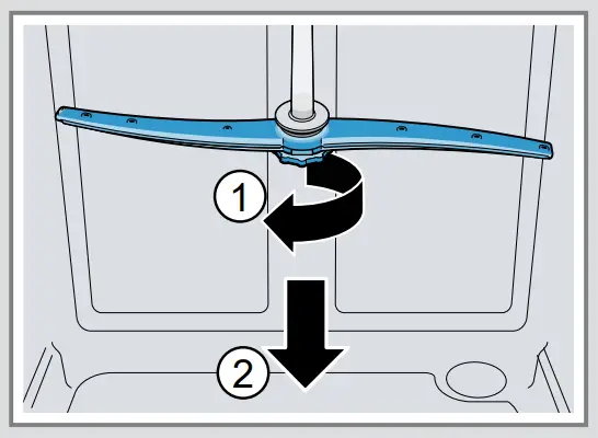 - Unscrew the upper spray arm 1 and pull down to remove 2 .