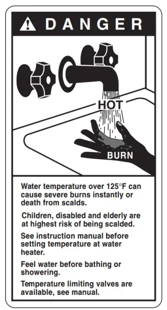 Safety and energy conservation are factors to be considered when selecting the water temperature setting of water heater’s thermostat. Water temperatures above the 125°F (52°C) can cause severe burns or death from scalding. Be sure to read and follow the warnings outlined on the label pictured below. This label is also located on the water heater near the thermostat access panel.