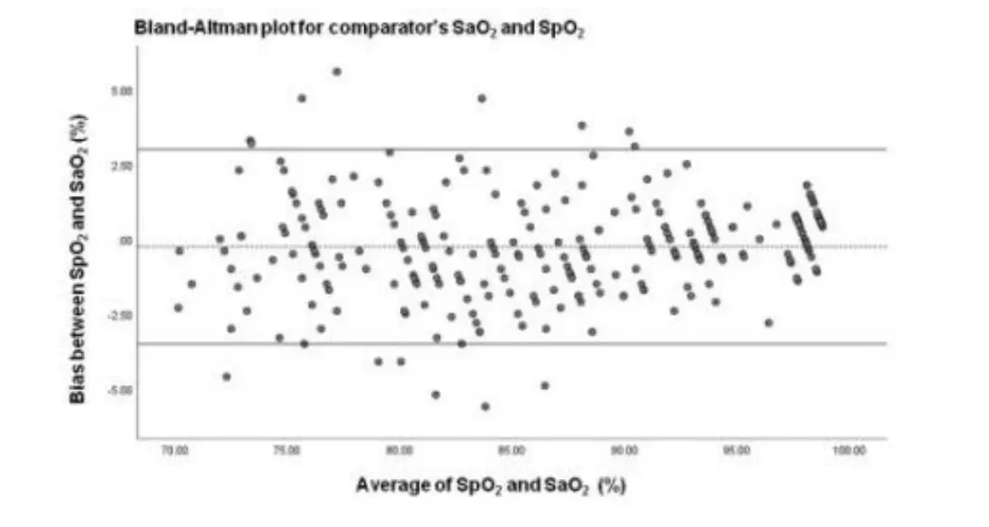 The figure below shows the Bland-Altman Plot of SaO2 vs SpO2 measured withthe investigational device.