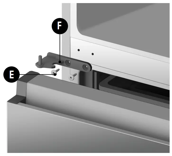 - Remove the 4 hex head bolts hinges (E) with an Allen wrench (5/32″,4mm). Remove the lower left and right door hinges (F).