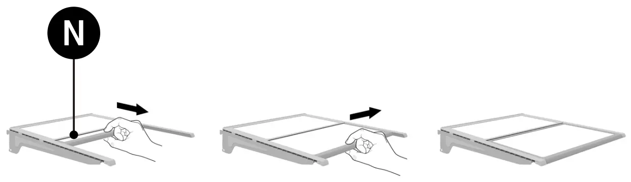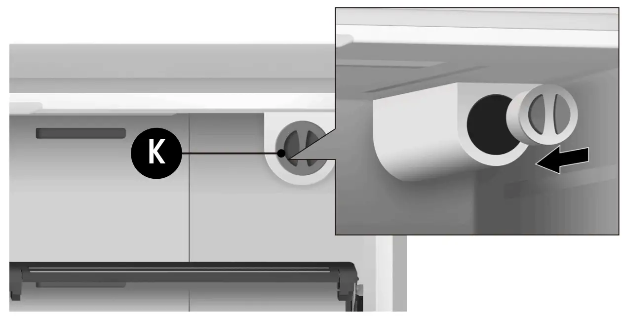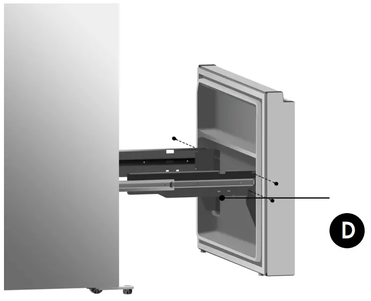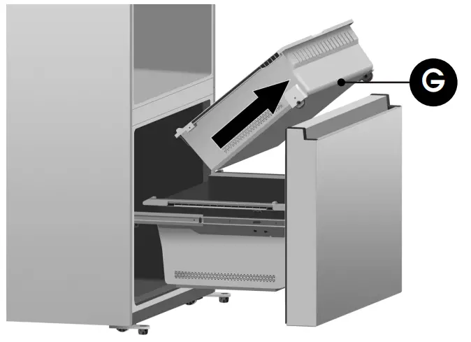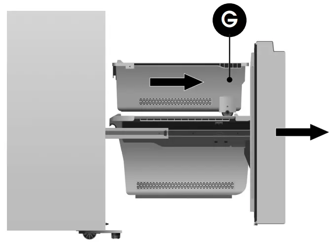 - Pull out the freezer door and the upper freezer drawer (G) to the final position.