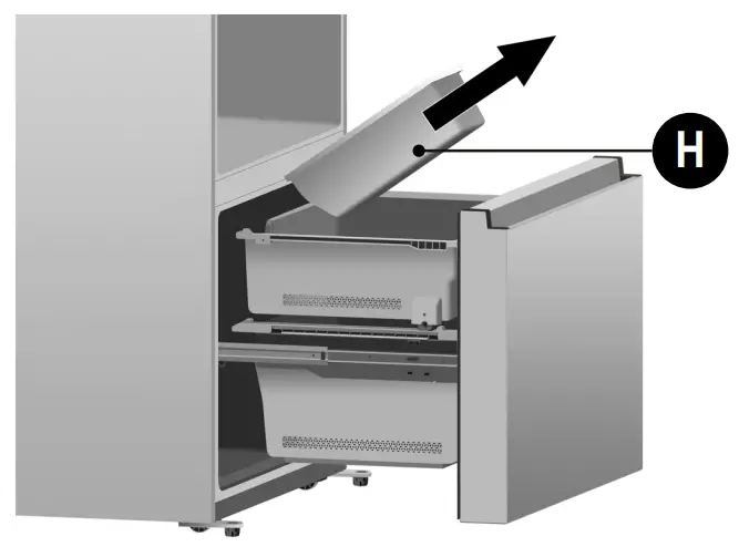 - Take out the ice storage box (H) by lifting it up in the direction of the arrow.