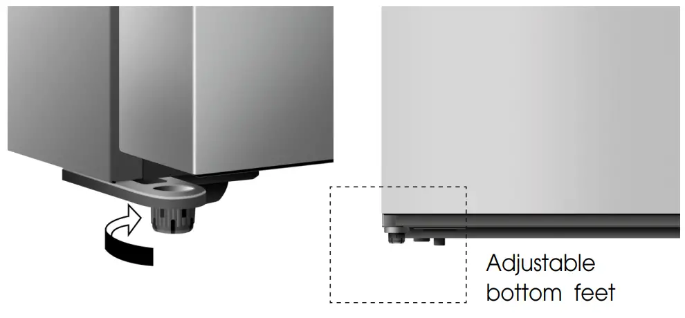 - For sufficient leveling and air circulating in the lower rear section of the appliance, the bottom feet may need to be adjusted. You can adjust them manually by hand or by using a suitable tool.