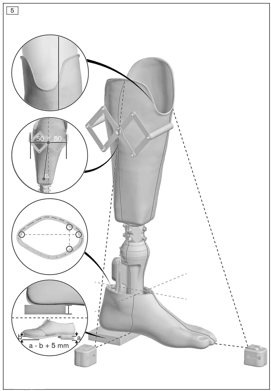 | 5 | Sagittal alignment: Determine the center of the prosthetic socket with the 50:50 gauge. Align the prosthetic socket centrally to the alignment refer ence line. Socket flexion: individual residual limb flexion + 5° |