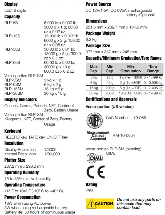 bThe Versa-portion RLP-S/SM is a multi-purpose bench scale that offers practical solutions for a full range of applications. Its internal resolution of 1/90,000 gives you maximum precision and accuracy. Its backlit LCD display enables operators to easily see weights. When portability is required, choose the optional rechargeable battery for over 60 hours of continuous usage. The Versa-portion RLP-S/SM is designed to reliably operate in many environments and withstand transport from one area of the plant to another or from one business to the next.