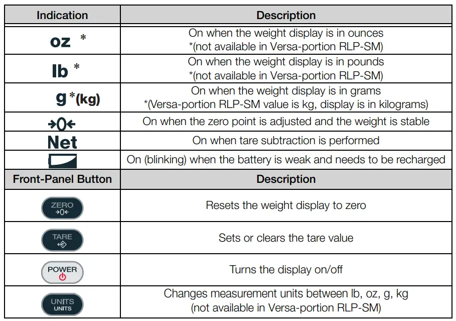 The Units button cycles through g, lb, and oz. (Versa-portion RPL-SM is only available in kg)