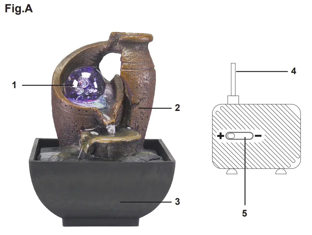 Place the decorative ball on top of the hole where water comes out, and the power cable inside the slot found on the back, making sure non to get the plug wet.