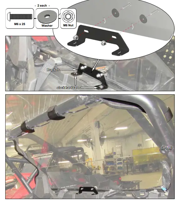 - Install Bracket to Rear Wall with stock hardware. Secure Windshield to Bracket with provided hardware..