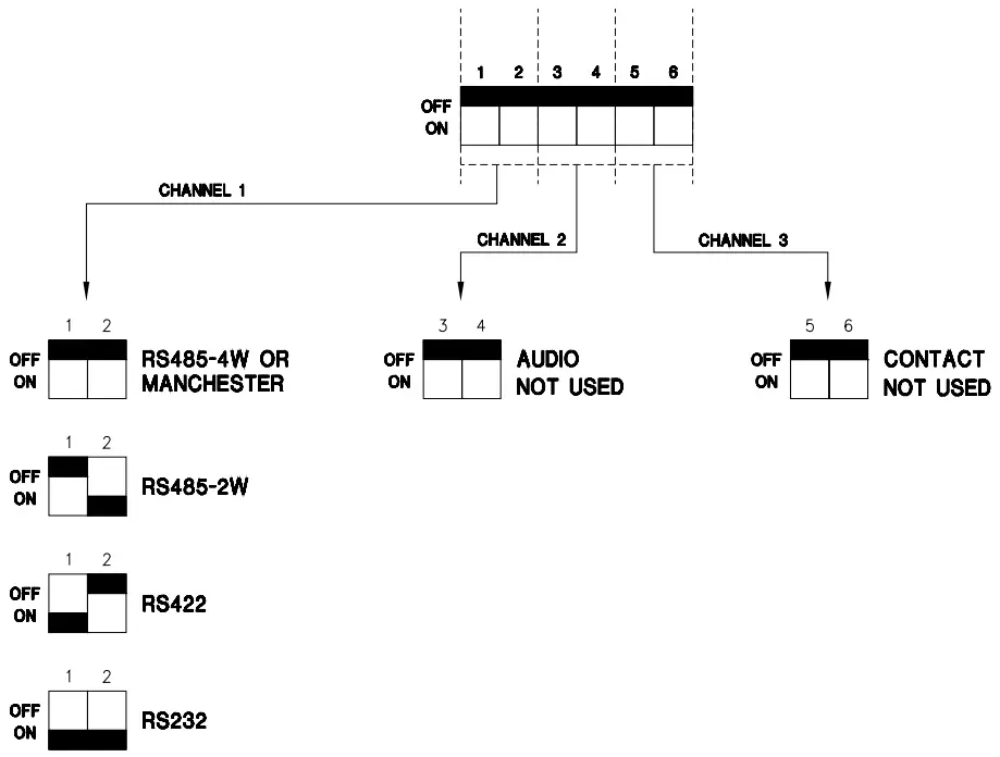 The RS485 channel may be configured for 2-wire (half duplex) or 4-wire (full duplex) operation with or without biasing. Switch selectable internal 120 ohm terminations are available for RS422 or RS485 data. The unit is shipped in the RS485 four wire configuration.
