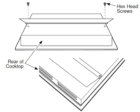 If a 30” clearance between the cooking surface and overhead combustible materials or metal cabinets cannot be maintained, a minimum clearance of 24” is required and the underside of the cabinets above the cooktop must be protected with not less than 1/4” insulating millboard covered with sheet metal not less than 30 gage (0.0125”) thick. A ventilation hood may be installed above the cooktop. See the ventilation hood installation instructions for the appropriate dimensions and clearances.