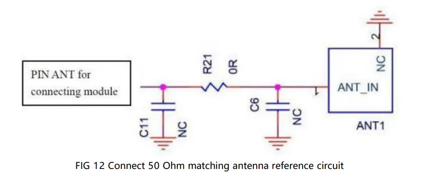 The antenna ANT1 in the figure above must be 50 Ohm. If the antenna is not matched, it is recommended to add a set of PI type matching network at the front of the antenna to match the antenna. Generally, the antenna manufacturers will give Suggestions on matching parameters.