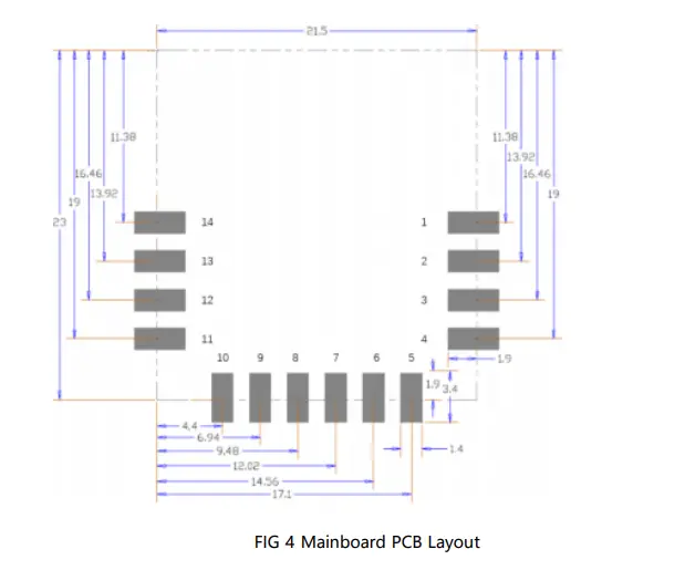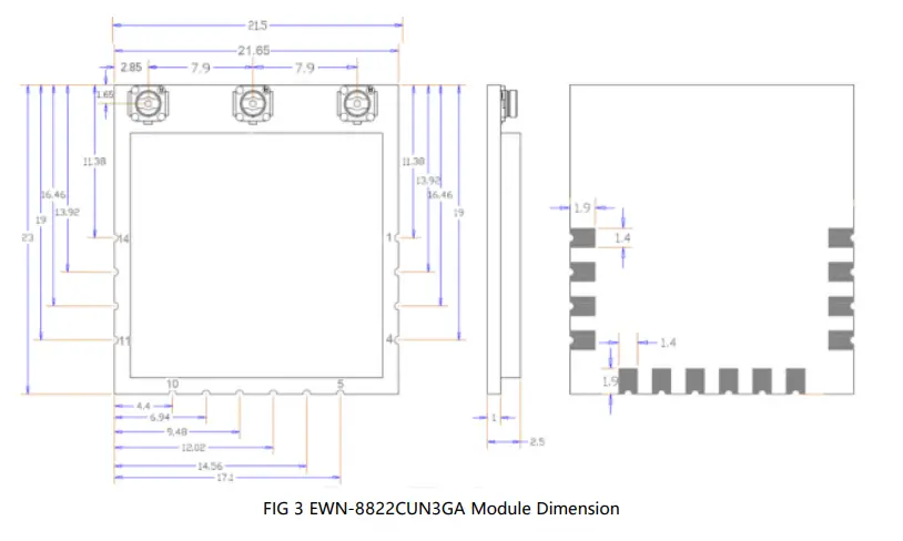 Module Dimension (unit : mm) :23.0mm ( ±0.3 ) *21.8mm (±0.3 ) *2.5mm ( ±0.3 ) 。