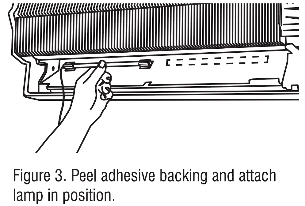 - Peel off paper from the adhesive backing on the mounting brackets. Press the lamp with the lamp brackets firmly in place about 2” from blower wheel. (Figure 3.)