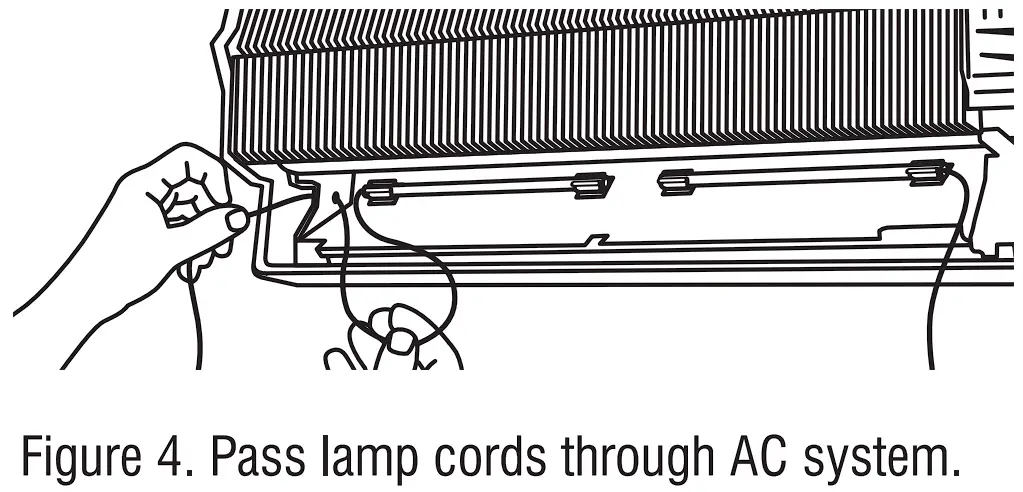 NOTE: Clock the lamp in the hexagonal lamp brackets so that the UV lights shine on the blower wheel and mold prone areas, NOT INTO THE ROOM. - Pass the UV lamp cables through the back of the AC system. (Figure 4)